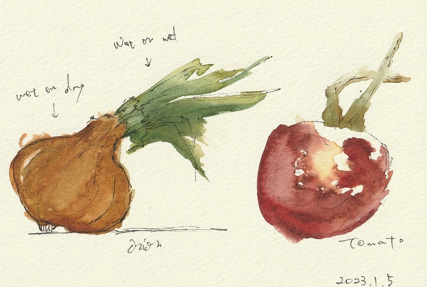 上の玉ねぎとトマトですが、迷いながらどうしていいのかわからないままに描いてます。でも色合いや濃淡の付き方とか俯瞰したときに愛らしく可愛いって思います。DIYでもそうなんですけど、それらしく作るってのは、とても面白いです。どうしたらそれらしく見えるのか。「それらしく」ってのはいったい何なのか。自分はいったいなにをもって「それらしい」と感じているのか。そういった自問自答の繰り返しで、目を深めながら自分を知っていく過程のようで。傍からどうみえるかはあまり気にならず、自分の中で「あ、かわい」って思えるだけで胸いっぱいというか。